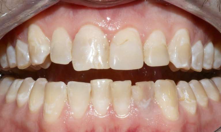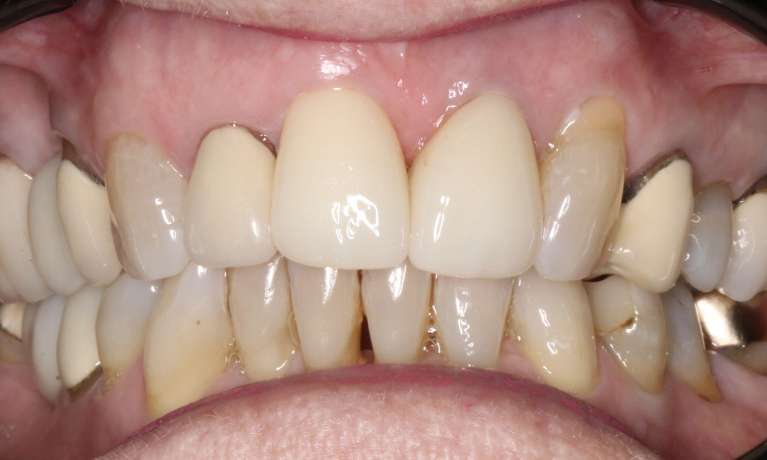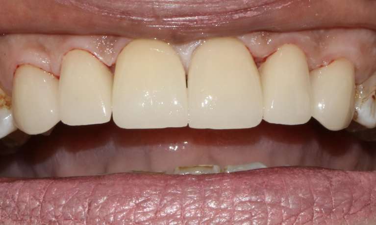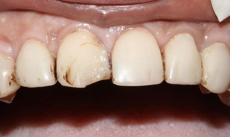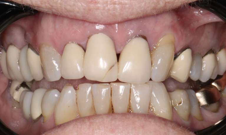 The crowns on the two upper central incisors were replaced to address a cracked crown and to mask discolouration visible at the gum line, leaving the patient with a fresher smile.