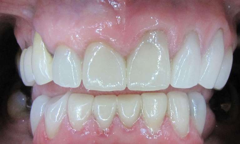 Six porcelain crowns were crafted to align the teeth and enhance the patient’s smile. This was a complex case due to bite and gum level considerations. To ensure complete satisfaction, the patient first received temporary crowns before the final ones were placed.